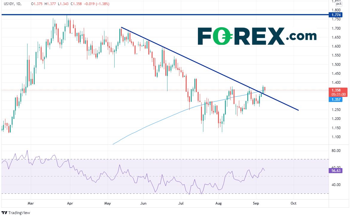 来看美国10年期债券收益率。收益率已站上5月高点以来的下降趋势线,周二还上破200天移动均线1.357,周三一直在该位附近徘徊。如果收上200天移动均线和周二高点(1.385),可能看涨并带动美元/日元走高。如果收盘回到1.338附近的趋势线下方,可能看跌,后市目标8月4日低点1.127附近,从而可能利空美元/日元。