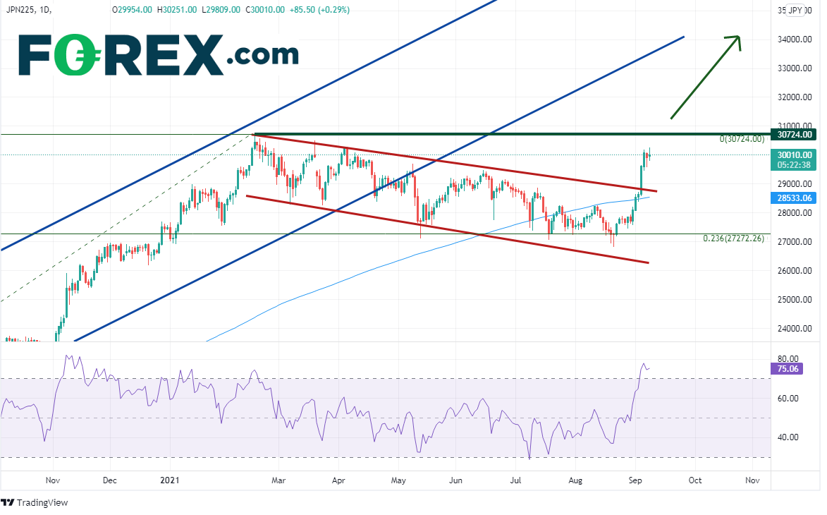 日本首相菅义伟宣布辞职后,看起来处于领先地位的候选人们纷纷给出新的疫情纾困计划,其中一位候选人提出一份金额高达30万亿日元的经济激励一揽子计划。受此影响,日经225指数摸至5个月高点,Topix涨至31年新高。另外,在股指走强、刺激计划有望出炉的背景下,日元兑包括美元在内的其它货币下跌。