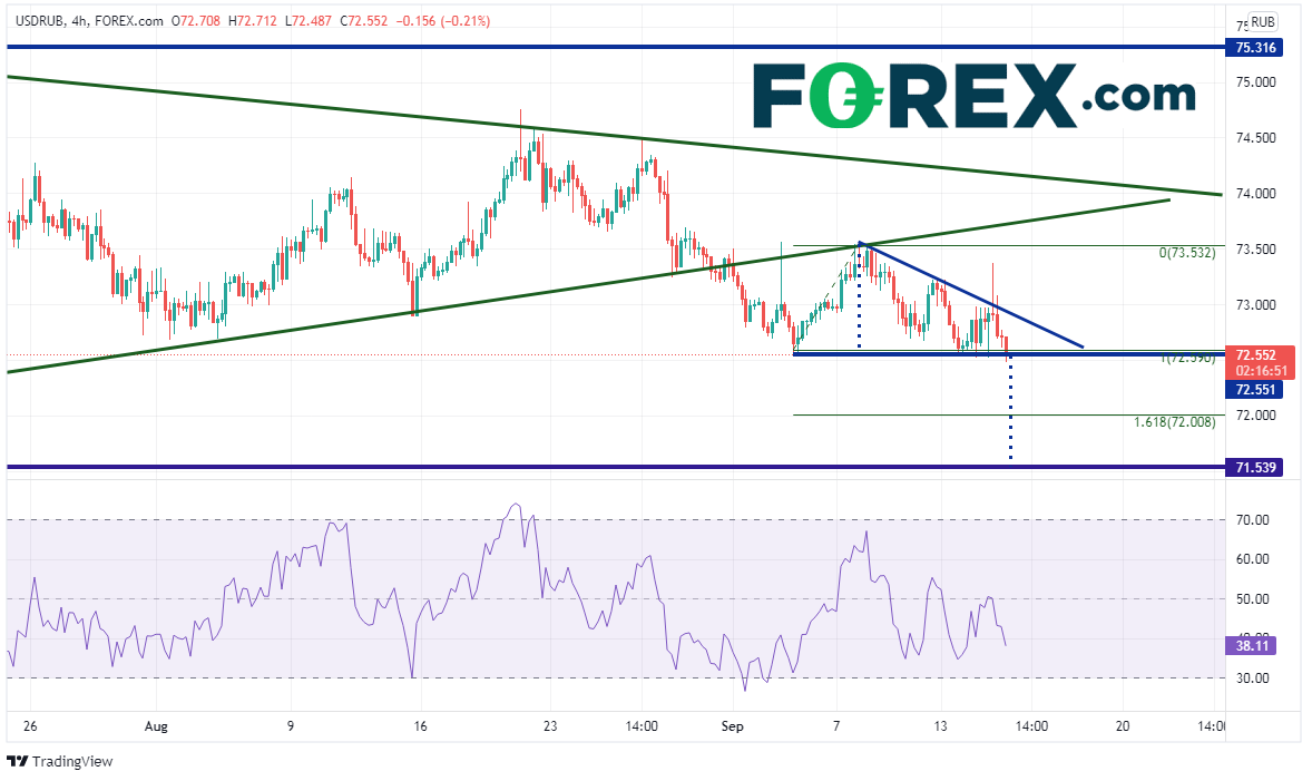 4小时图上,美元/俄罗斯卢布下破较小的对称三角形并下跌后于9月7日反击下轨趋势线73.50附近但以失败告终,现正考验9月3日低点72.55附近的水平支撑位。请注意,美元/俄罗斯卢布形成了较小的下降三角形。下降三角形突破后的目标为突破位加上三角形高度,本文中为71.53附近,即6月以来水平支撑位附近。但到达该目标之前,首先必须击穿9月3日低点到9月8日高点的161.8%扩展位,即72.00附近。盘中阻力位在通道的下降趋势线,即72.91附近,然后是周三的上影线高点73.37附近,接着是9月8日高点73.53附近。