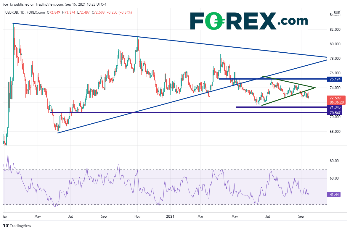 美元/俄罗斯卢布日图在2020年3月创下疫情高点以来一直交投于对称三角形内。2021年5月初,价格终于下破三角形下轨趋势线74.20附近,于6月11日创下71.55低点,之后反弹并再度测试三角形的下轨趋势线,期间的7月初构筑较小的对称三角形(请看下图的绿色线)。8月31日,价格下破该绿色三角形所在的73.25附近。