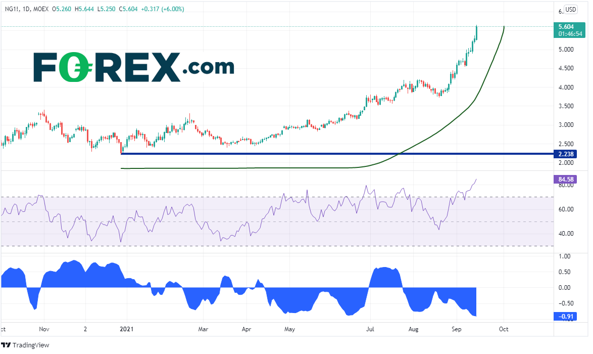 天然气价格最近大涨,相比2020年12月28日低点2.238飚升近150%,其中仅过去一个月就斩获近50%的涨幅。因为德国方面持续不断的关切,北溪2号工程可能延期。所以,目前还不确定这个冬季俄罗斯是否可以为欧洲提供足够的天然气。英国一家电厂发生火灾后关闭,这提升对天然气等替代品的需求,从而推高天然气价格乃至整体电价。另外,美国陷入飓风和热带风暴,关闭了一家液化天然气厂(LNG),天然气价格因此骤然上升。RSI诚然处于84.37的超买区域,但该指标在价格呈抛物线走势时失效。