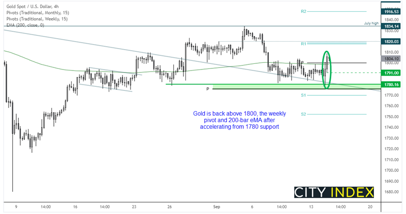 对于昨天揭晓的通胀数据,黄金多头显然喜爱有加,因其削弱了美联储提前缩表的前景。8月26日以来,1780一直是可靠的支撑位,除了少数几次外,金价基本守住破败趋势线,而且现在动能已转为上行。4小时图上的看涨吞噬K线标志着1780附近是最终的低点,金价有望站上1800,即200天指数移动均线、周图枢轴点和前周期高点所在。守住1790我们短线继续看涨。