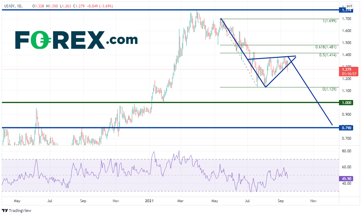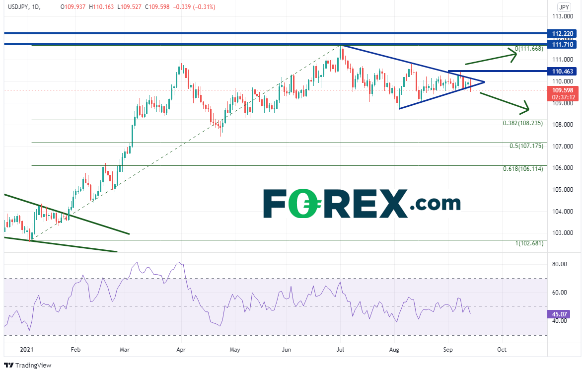 美元/日元最近对日元交易者一直不友好,但其终于准备好突破了吗?该货币对的日图显示,2021年上半年只有一个方向,那就是上涨。美元/日元在1月6日最低跌至102.59,而在7月3日最高到111.65。但从那以后,该货币对一直交投于对称三角形并盘整、逼近三角形的尖端。9月8日,该货币对假上破三角形后回到水平阻力位110.46附近。美元/日元周二似乎蓄力下破三角形。这是否有望给日元交易者带来等待已久的入场机会?