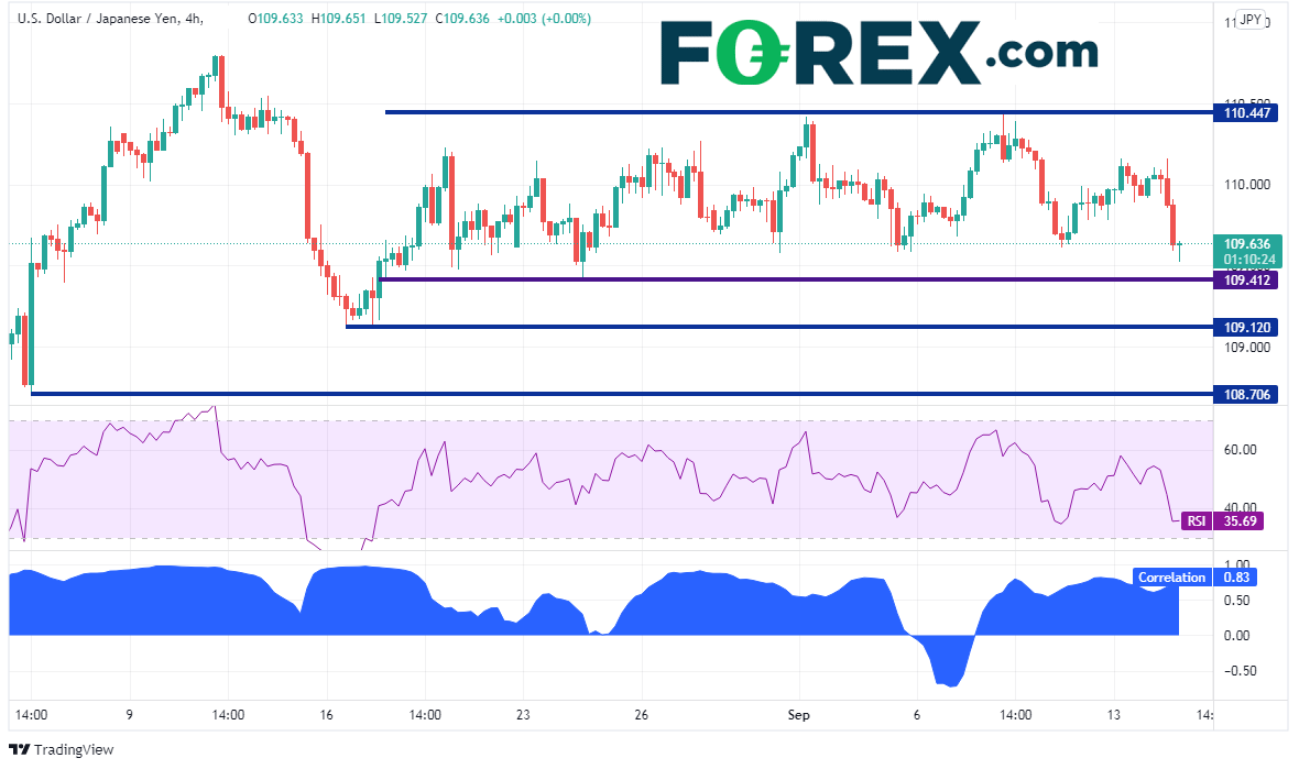 在价格迈向对称三角形两条趋势线相汇点的时候,几乎没有波动性,直至三角形被突破。美元/日元4小时图的走势也是如此。8月18日以来的近一个月里,美元/日元一直交投于109.41-110.45这一104点子的区间内。美元/日元周二下破三角形,下探区间低点,到达109.53。请注意,此文发稿时的最新K线正在形成锤子形态,那是潜在反转的信号,但尚未定局。下方支撑位在109.41,接着是8月6日低点109.11,还有108.70附近。阻力位在周一低点109.90附近,然后是周二高点110.16。如果站于其上,上看区间高点110.46。