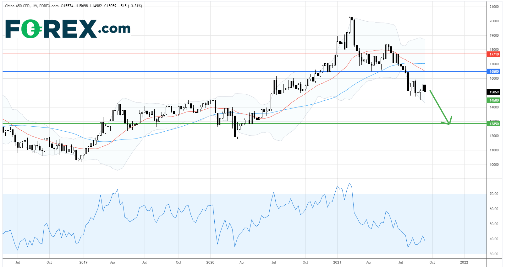在週线图上,中国A50指数CFD仍未能展开强劲的反弹,并受制于下行20週均线。相对强弱指数亦处于卖出区间30至50之间。
