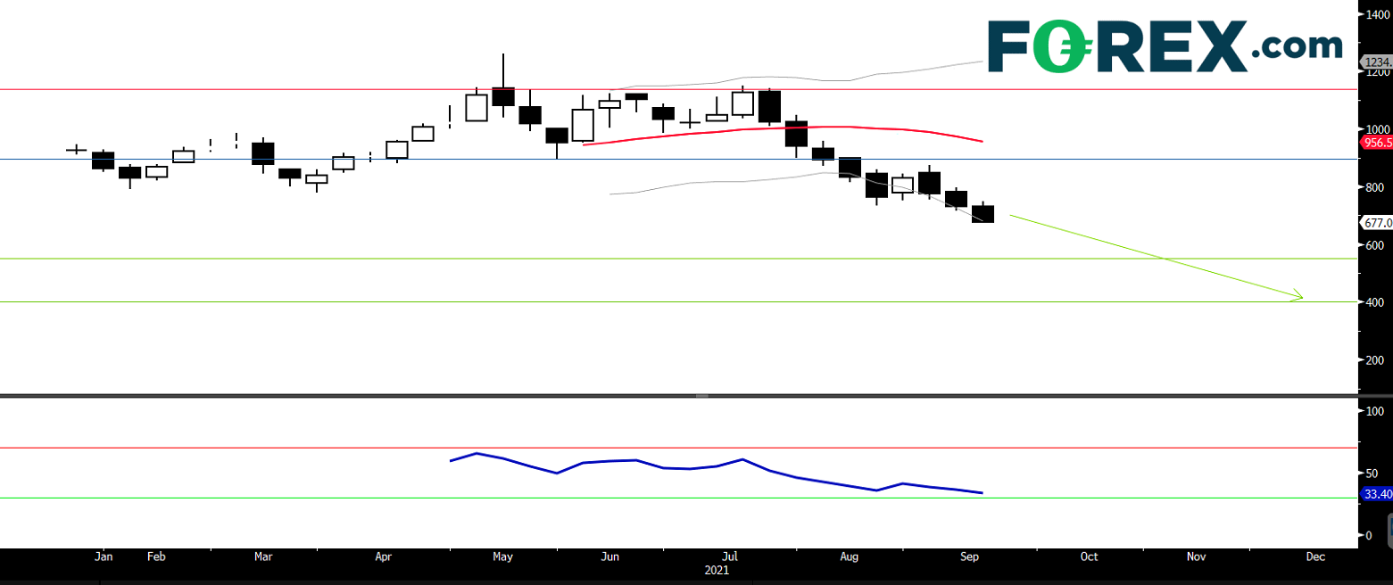 在週线图上,由于大连铁矿石期货价格由今年5月高位重挫并陥入技术性熊市。铁矿石价格由7月中至今只有一週反弹,馀下的日子均以阴烛收跌,表明目前跌势持续。相对强弱指数已跌至30多点,亦指出强劲的下行动力。