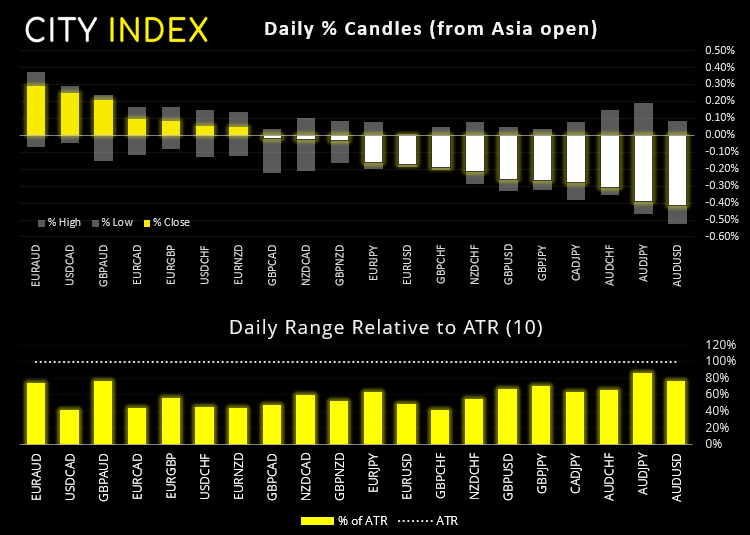 英镑/日元失守150.83支撑位后跌至三周低点。随着避险资金流入,日元和美元仍表现坚挺,澳元和加元为目前走势最弱主要货币。