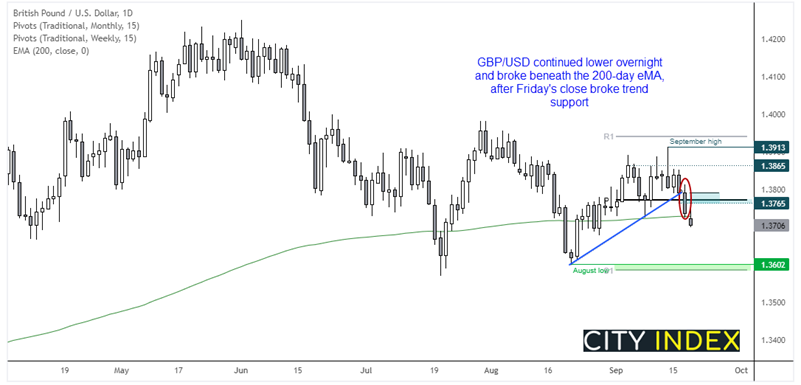 英镑/美元在周五跌穿趋势支撑位后,隔夜失守200天EMA均线。自9月高点以来,货币对已下挫了约1.5%,距触及8月低点还有约0.75%的下跌空间。1.3765下方继续看跌,但今天的高位可用来微调风险管理。