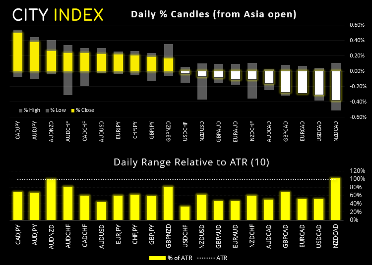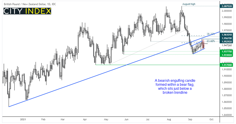 然而,交易者可能需要往上看,因为新西兰联储下个月可能加息25个基点,这种前景比其它央行强硬得多。所以,现在是重新观察英镑/纽元潜在看跌结构的好时候。英镑/纽元自8月高点以来实际上直线下跌,在这波推动浪中,过去两周稳步反弹但未能到达其38.2%的回档位。因此,昨天形成的看跌吞噬K线暗示修正高点形成于1.9567,其本身低于破败趋势线。受制于1.9567我们继续看跌,等待突破1.9330支撑位,目标1.9200。
