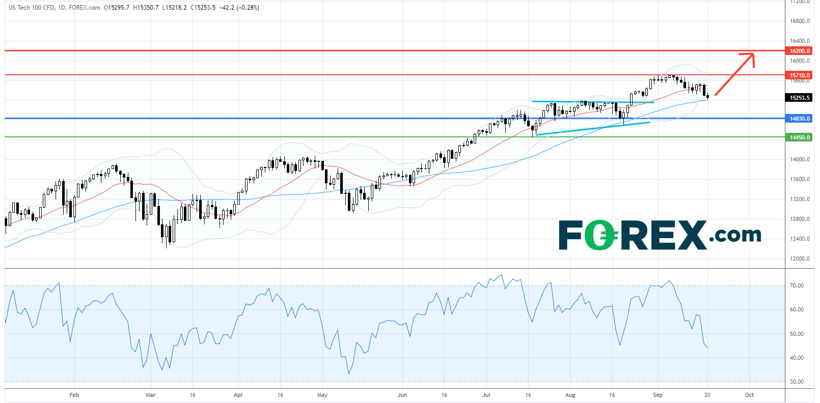 美国科技股100指数CFD : 仍守在主要支持位14,830点之上