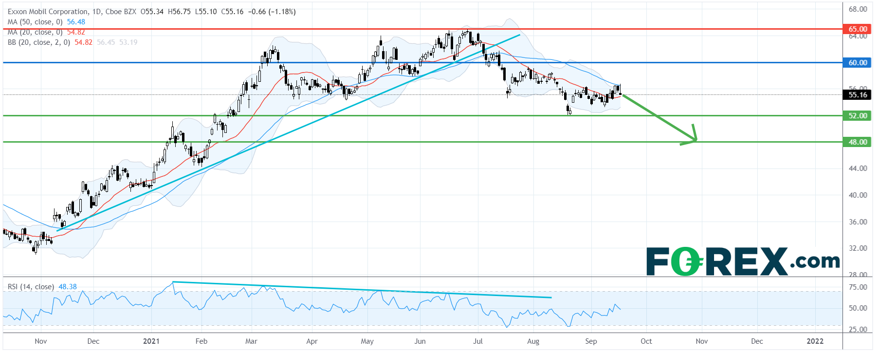 从技术角度看,如日线图所示,艾克森美孚的调整走势尚未结束。它跌破了11月以来的上升趋势线后,呈现一浪低一浪的格局,并受制于50日移动均线。