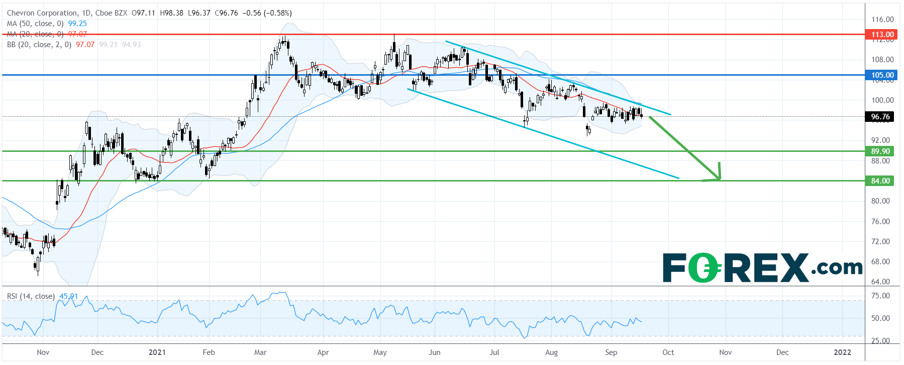从技术角度看,如日线图所示,雪佛龙仍然维持短线的下行趋势。它在6月以来的下降通道内交投,并且受正在下降的20日及50日移动均线压制。