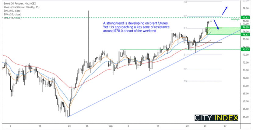 布伦特原油期货四小时图构筑强劲趋势。自8月低点以来已形成一系列低点抬高,看涨动能于7月来临前有所增强。再加上看涨基本面因素,支持油价最终升穿78.00。但我们可能会看到价格先自该水平回调,因此处为一个关键的波段高点,加之周末即将到来(部分交易员希望周末前获利了结),周图2号阻力枢纽也落在该区域。如果美元走强,布伦特周末前逆势下跌的概率攀升,但我们仍对75.63-76.55区域上方持看涨兴趣,预计价格稍后会展开突破。或者多头可先行等待价格站上78美元并看看该阻力位能否转为支撑。