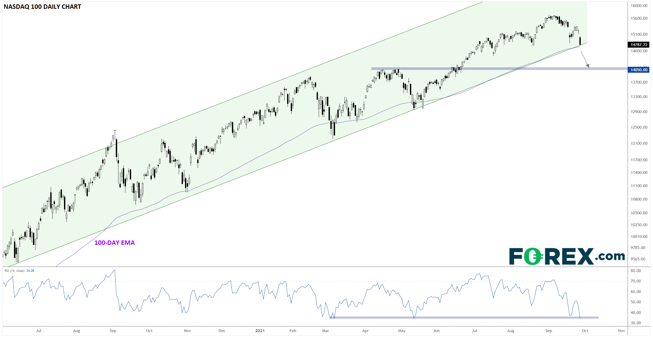 在周二利率再度上升的环境中,纳斯达克100指数成为美国主要股指中最弱的那个,此文发稿时跌逾2.5%。最关键的是,该股指正在考验其持续15个月的上涨通道的下轨构成的关键支撑兼100天指数移动均线所在的14700区域: